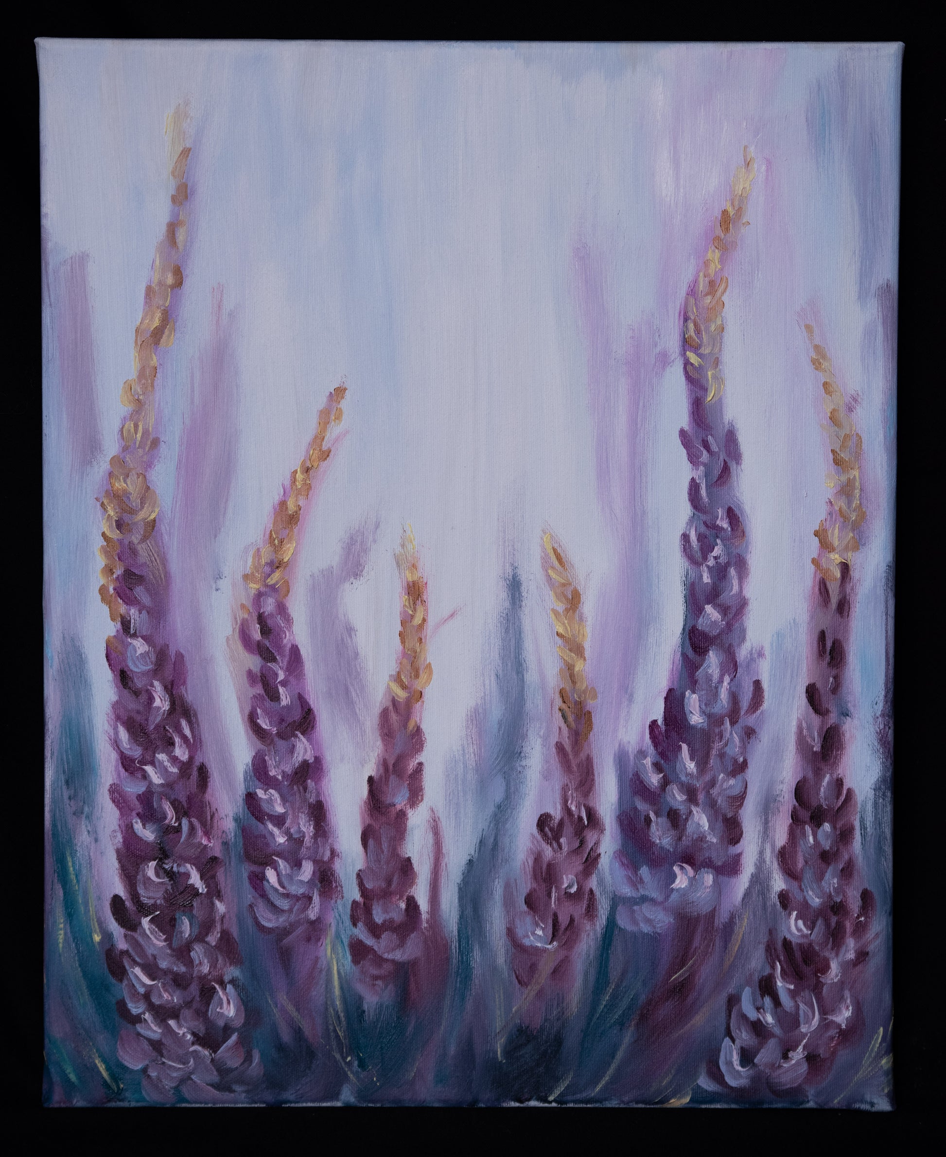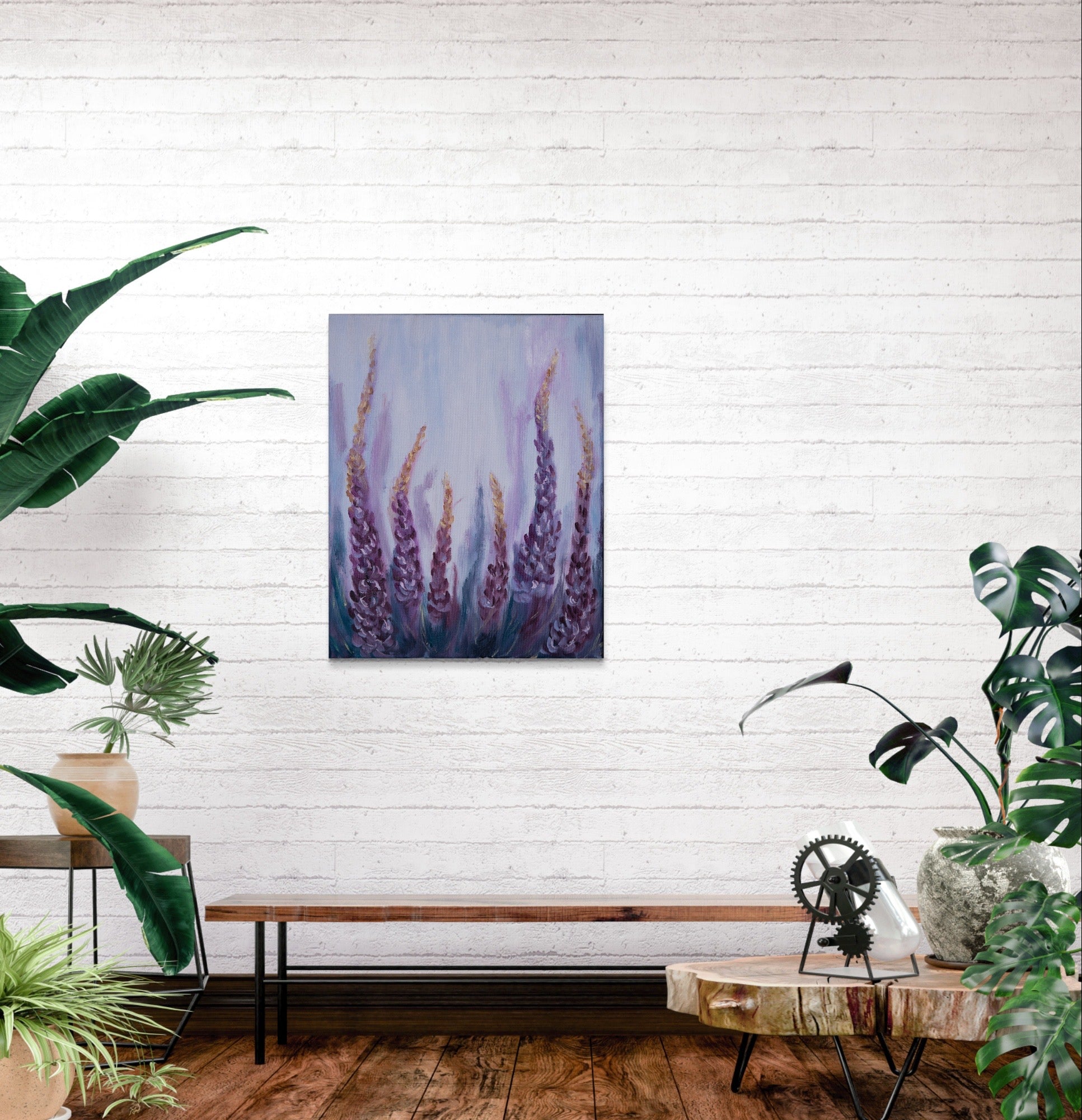"Lupins in the Fog" is a serene and captivating piece from the "Magic Garden" collection. This artwork, painted in oil, beautifully portrays lupins shrouded in a delicate mist. It holds a special place as my daughter's favorite, which she fondly calls "alluring and soothing lupins." The soft purple and golden hues of the flowers blend seamlessly with the misty background, creating a tranquil and ethereal scene. This painting evokes a sense of calm and wonder, capturing the enchanting allure and soothing presence of lupins in their natural, fog-kissed environment.