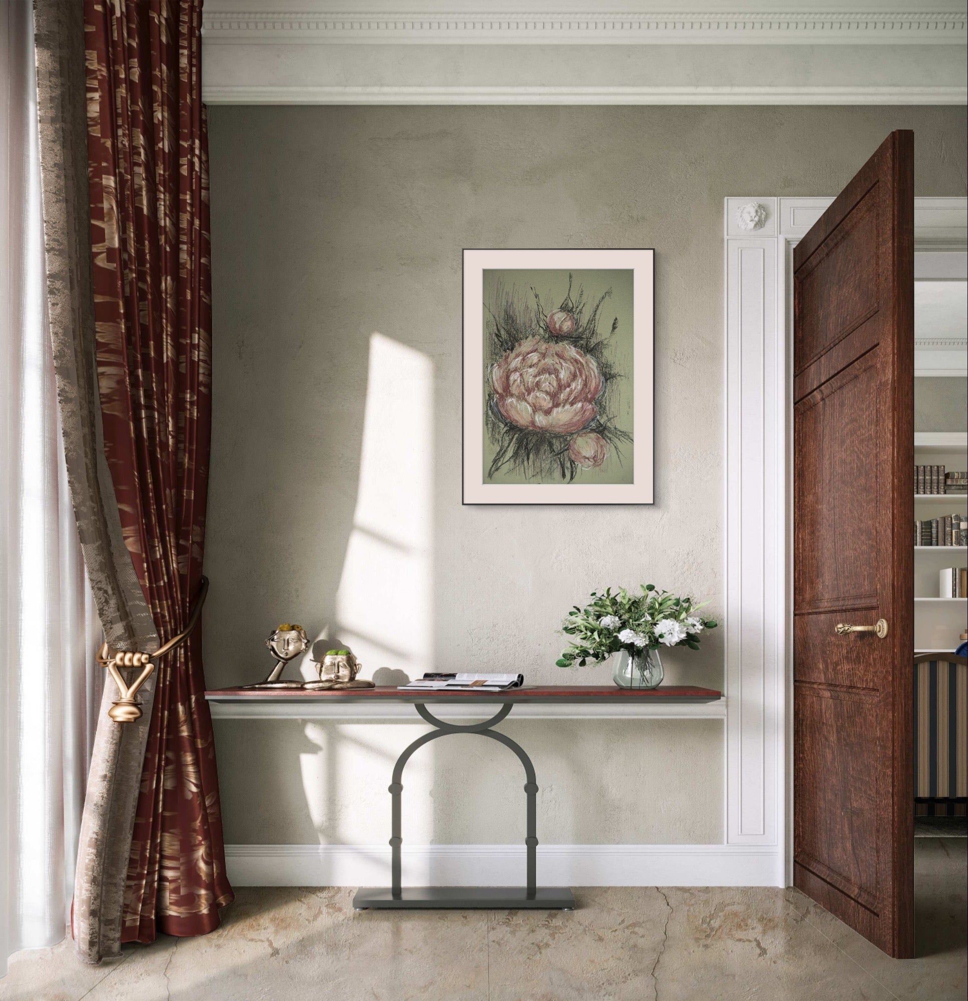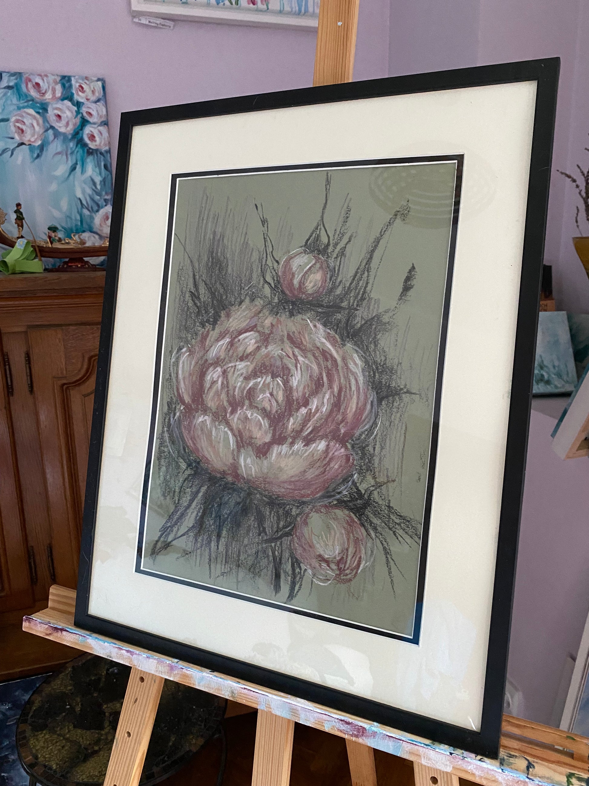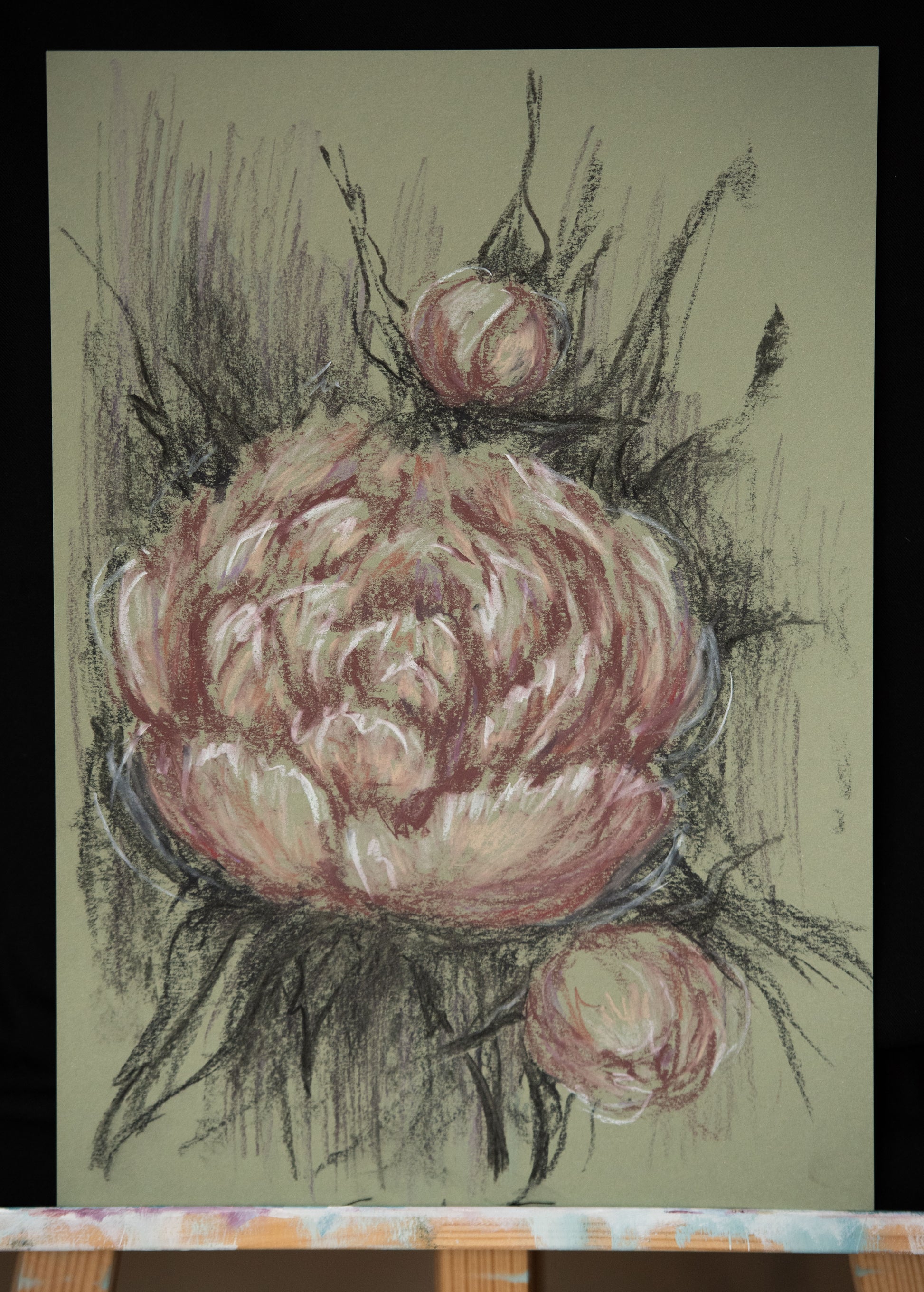 "Peon in the Haze" from the 'Magic Garden' series is a striking charcoal artwork that captures the subtle beauty of peony flowers enveloped in a soft, hazy atmosphere. The gentle blending of grays and muted pinks against the dark, sketchy outlines of foliage brings a dreamlike quality to the image, emphasizing the delicate and ephemeral nature of the peonies. This piece brilliantly utilizes the medium of charcoal to convey both the texture of the petals and the ethereal quality of the surrounding haze, making it a captivating addition to any collection that appreciates floral art infused with a sense of mystery and tranquility.