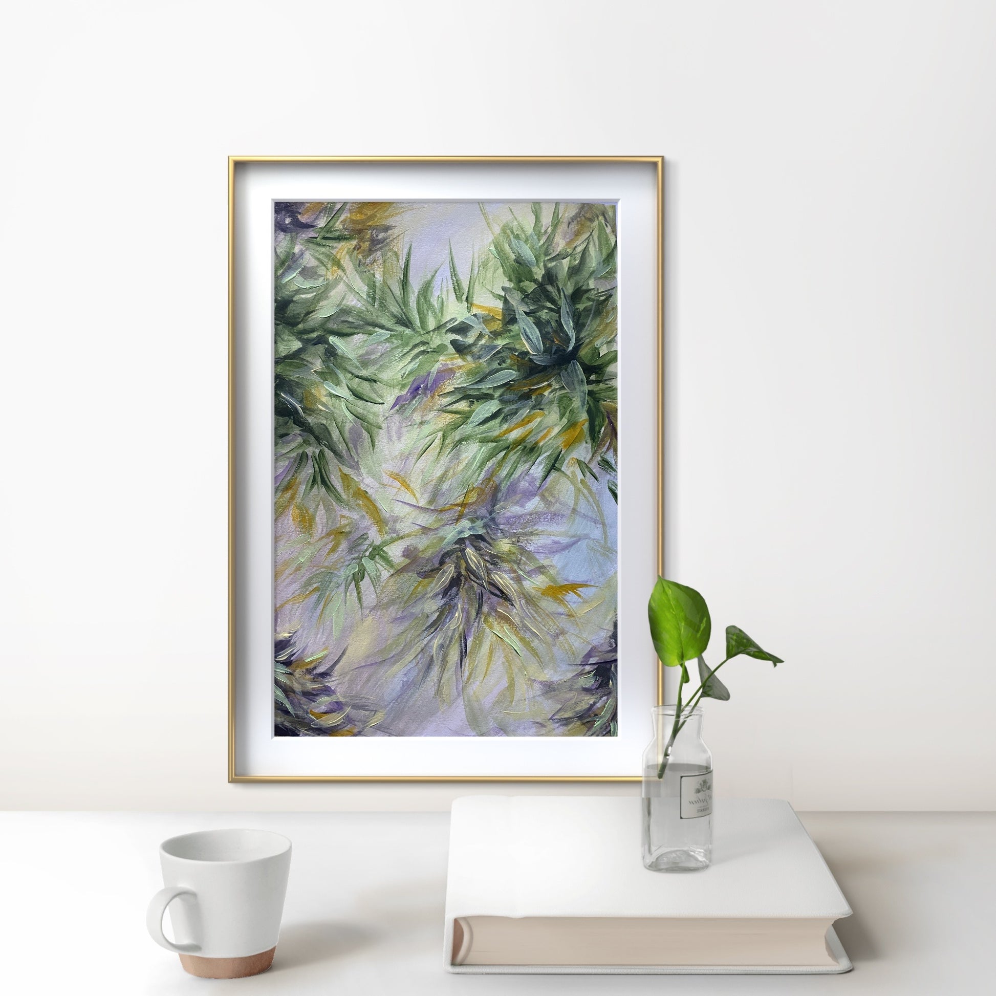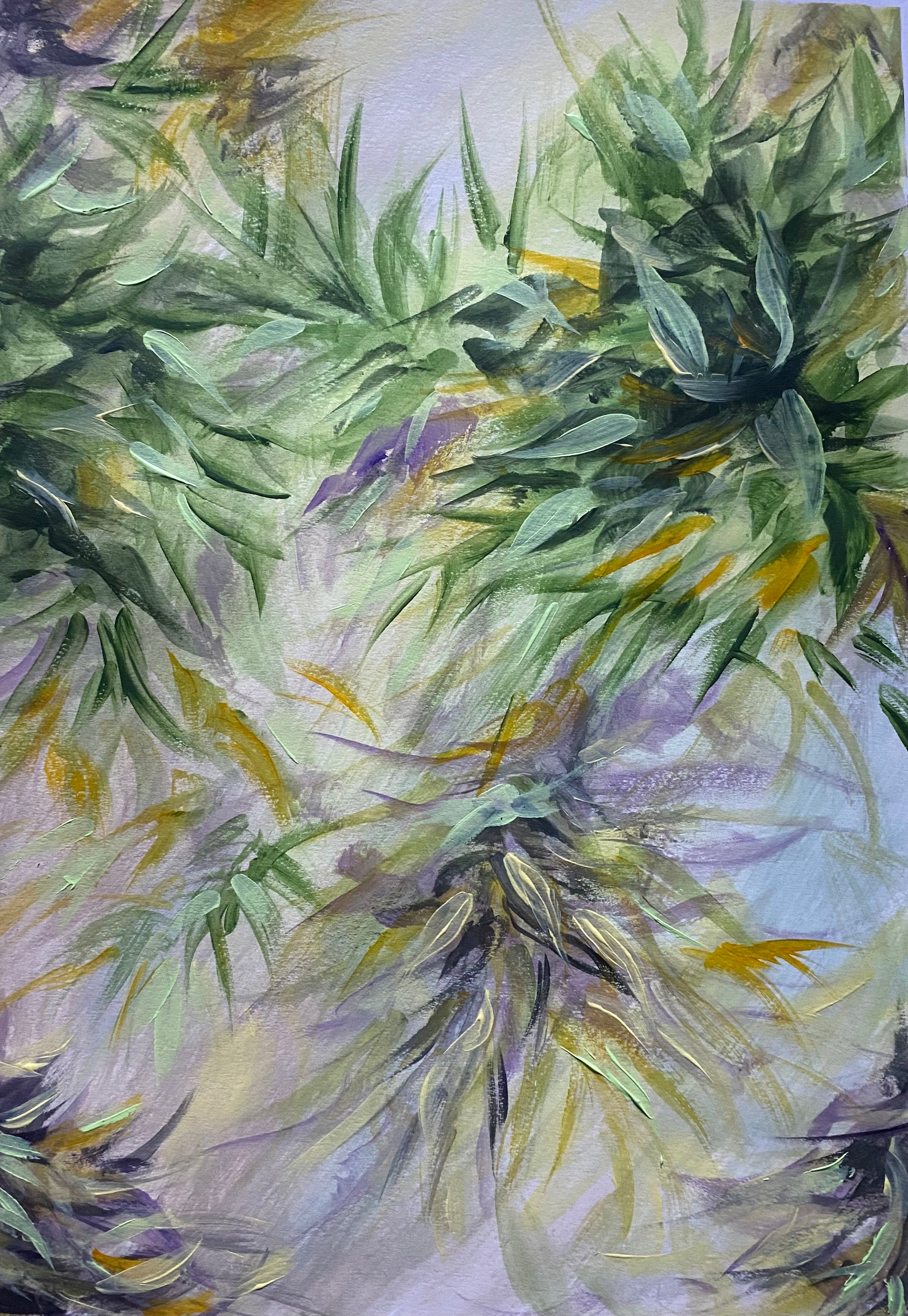 "Sunlight" captures the vibrancy of nature through the medium of acrylic, showcasing an energetic composition of green foliage bathed in subtle hues of yellow and purple, conveying the fleeting effects of sunlight filtering through leaves. The artwork's dynamic brush strokes and the interplay of light and shadow evoke a sense of movement, reminiscent of a gentle breeze in a serene garden. This piece would be a refreshing addition to any collection, bringing a touch of the natural world's tranquility and beauty indoors.
