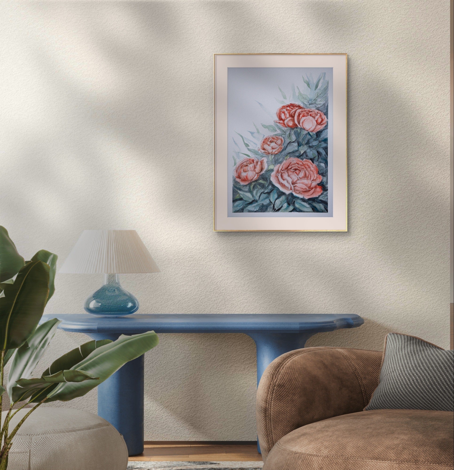 "Tender Touch" is a delicate watercolour painting that focuses on a lush cluster of roses. Soft hues of pink and orange blend harmoniously with subtle green foliage, creating a serene and gentle representation of nature. The detailed brushwork enhances the texture of the petals and leaves, inviting the viewer into a tranquil garden scene. This artwork beautifully captures the essence of serenity and the fragile beauty of roses, making it a lovely addition to any collection that appreciates floral art.