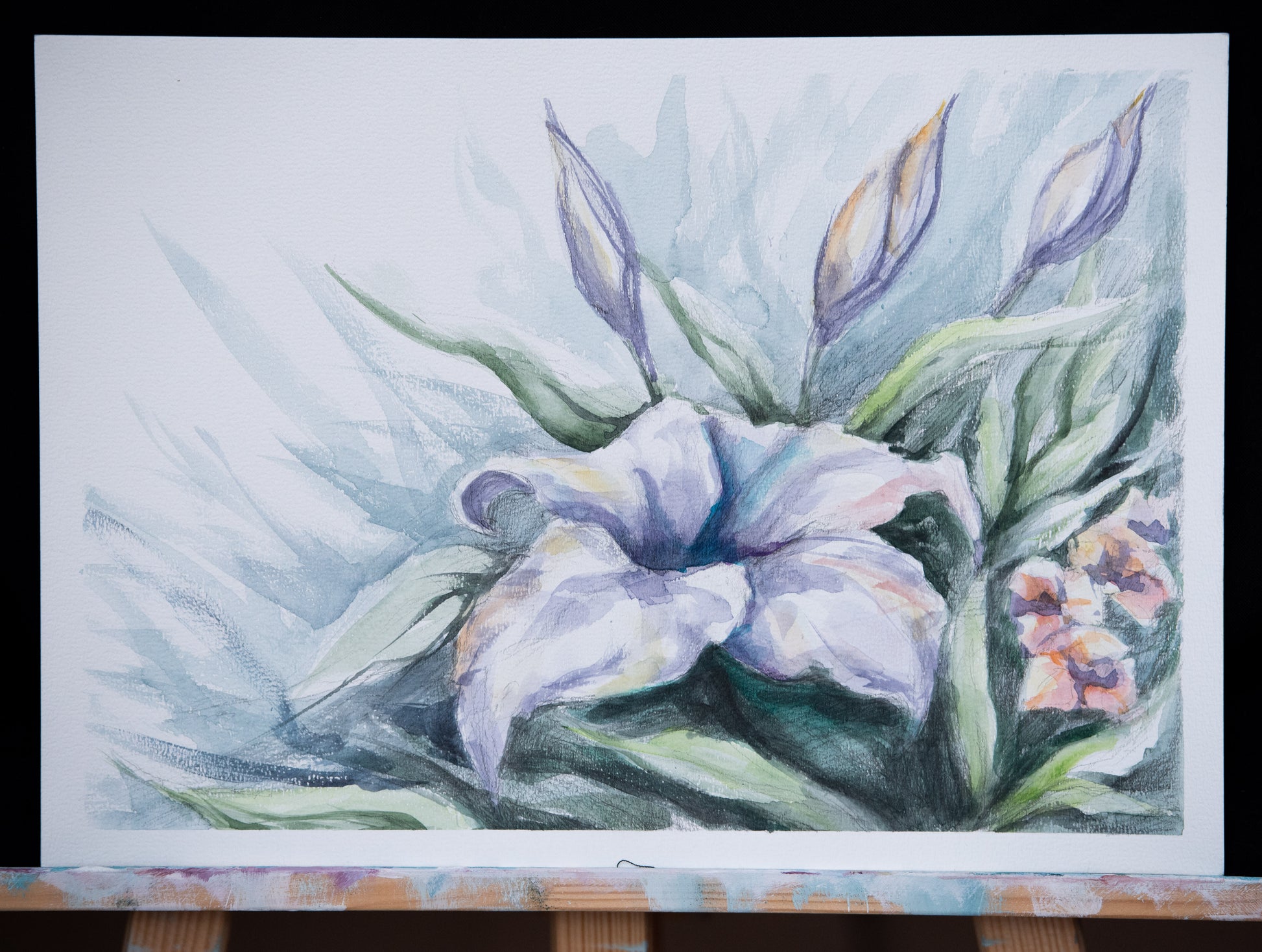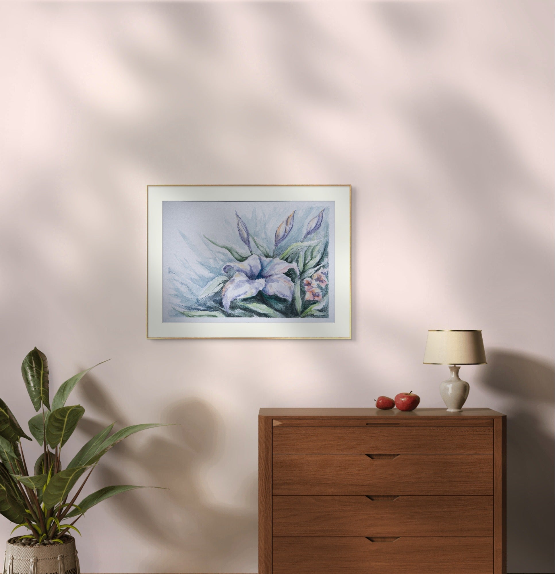 "Transparency" is a watercolour on paper painting that features an intricate depiction of iris flowers. The artwork is marked by its soft, pastel tones that blend seamlessly into each other, creating a delicate interplay of colors that suggest transparency and lightness. The composition focuses on the gentle curves and subtle hues of the iris petals, surrounded by a background of softly defined leaves and buds, enhancing the overall ethereal quality of the scene. This painting invites viewers into a tranquil, serene setting, reminiscent of a dew-kissed garden at dawn.