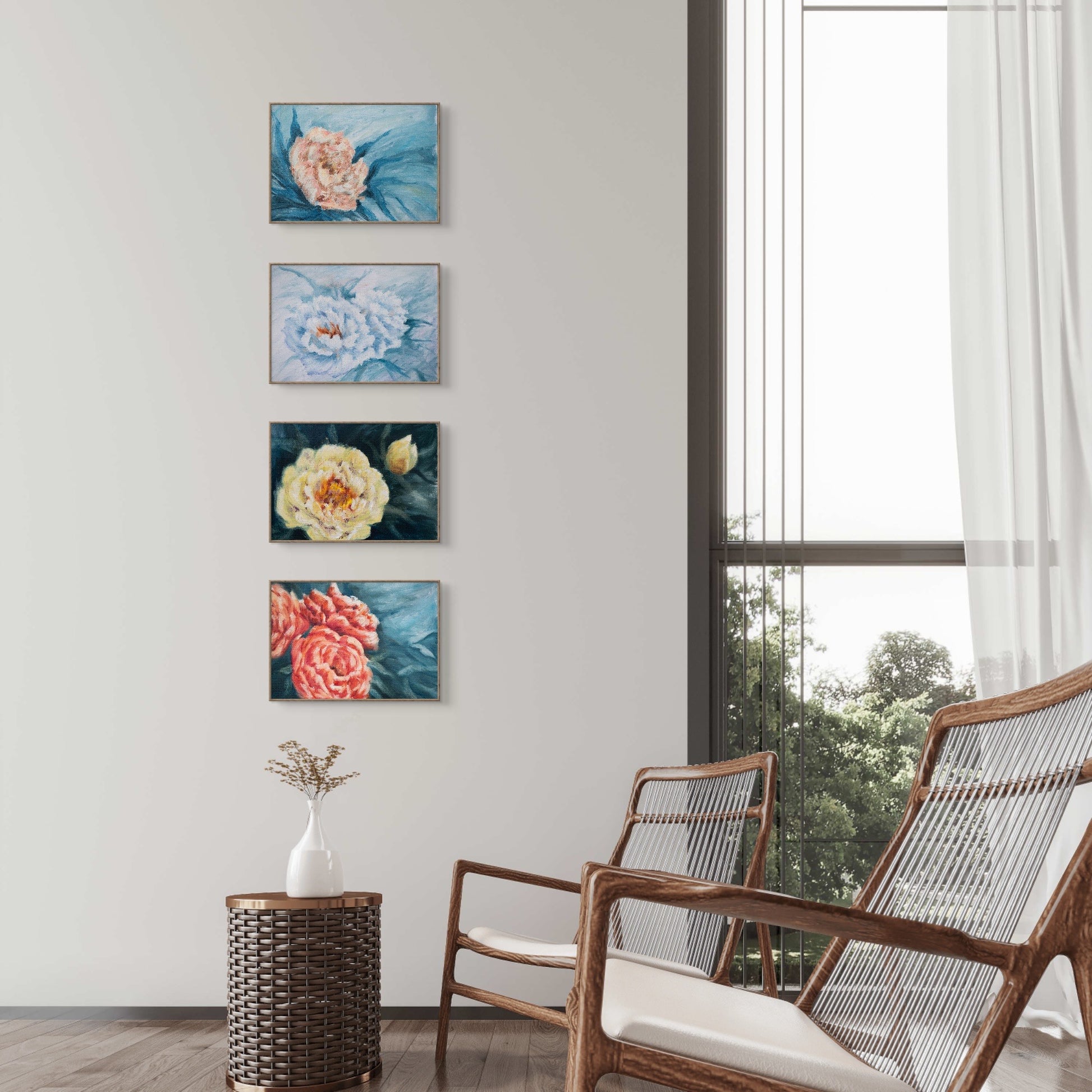 "Sunlight Peony" is a captivating artwork executed in oil on paper, depicting a peony in bloom with rich textural details and vibrant contrasts. The composition focuses on the lush, soft petals of the flower, beautifully highlighted against a dark, ambiguous background, enhancing the flower's radiant yellow and warm tones. This piece may evoke feelings of growth and vitality, characteristic of spring and the flourishing of flowers.